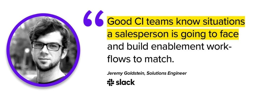 “As a salesperson, your biggest fear is if you say something incorrect about a competitor, and a client knows you’re incorrect, you’ve lost all credibility. Good CI teams know the situations a salesperson is going to face and build enablement workflows to match those situations.”