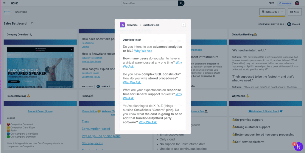 Questions to ask battlecards are becoming increasingly popular as organizations shift sales strategies towards using playbooks. Meaning, sales pitches for a product that evolve and adapt dynamically. This is in contrast to rigid sales pitches that can come off as inauthentic and overrehearsed.