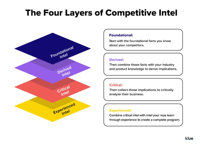 - Critical Intel: This layer involves packaging competitor information so that it can leveraged as a tool by your organization. Packaged formats can include battlecards, intel digests, Slack channels, and more. This layer addresses questions like:
