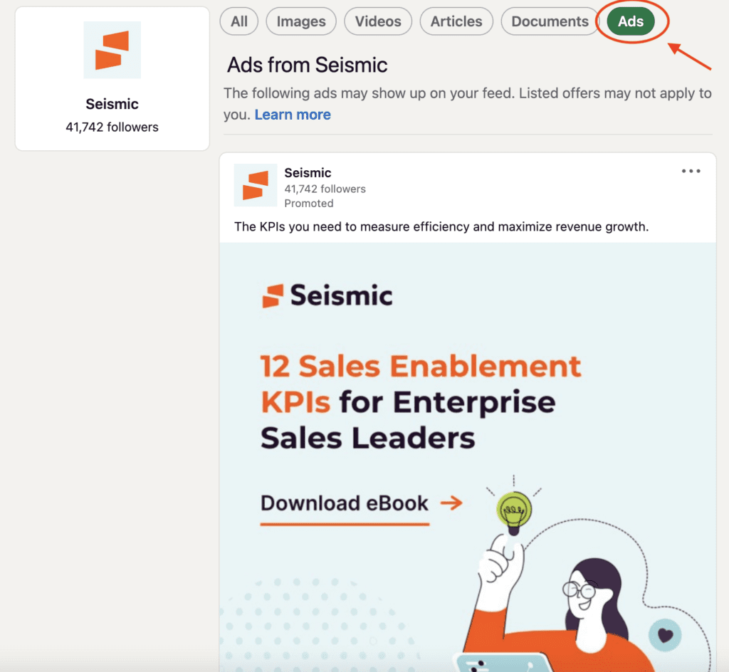 Head over to your competitor’s LinkedIn page. Click ‘posts’. On the right hand side, click the tab ‘Ads’.
