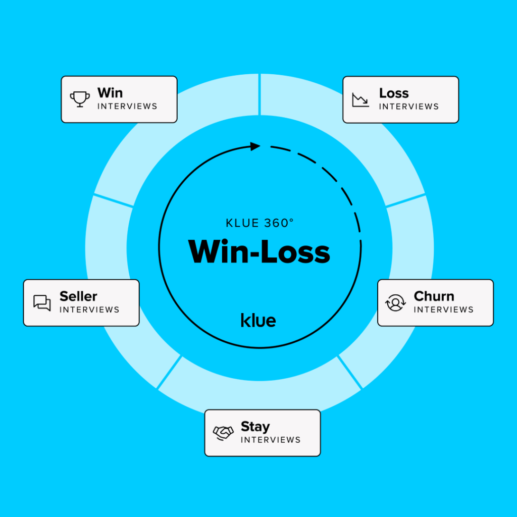 With Klue’s 360° Win-Loss, you can gather intel from win, loss, stay, churn, and seller interviews across three different types of research to give you a complete view of your buyer.