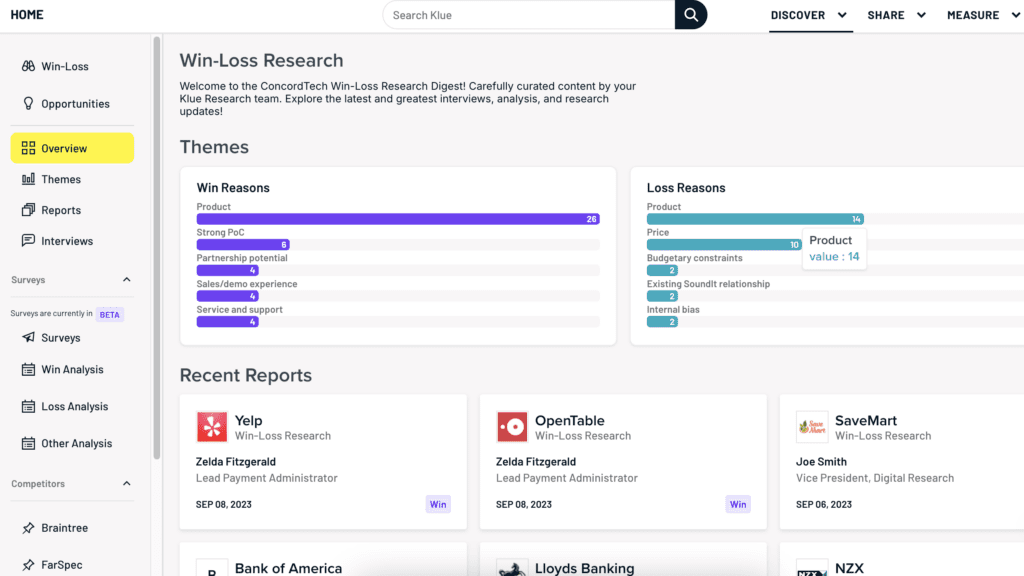 Klue uses AI to do the work for you, giving you an instant snapshot of key findings across all of your buyer and seller interviews including win-loss reasons, featured highlights, and more. With predetermined and custom tagging, you can save countless hours on analysis.