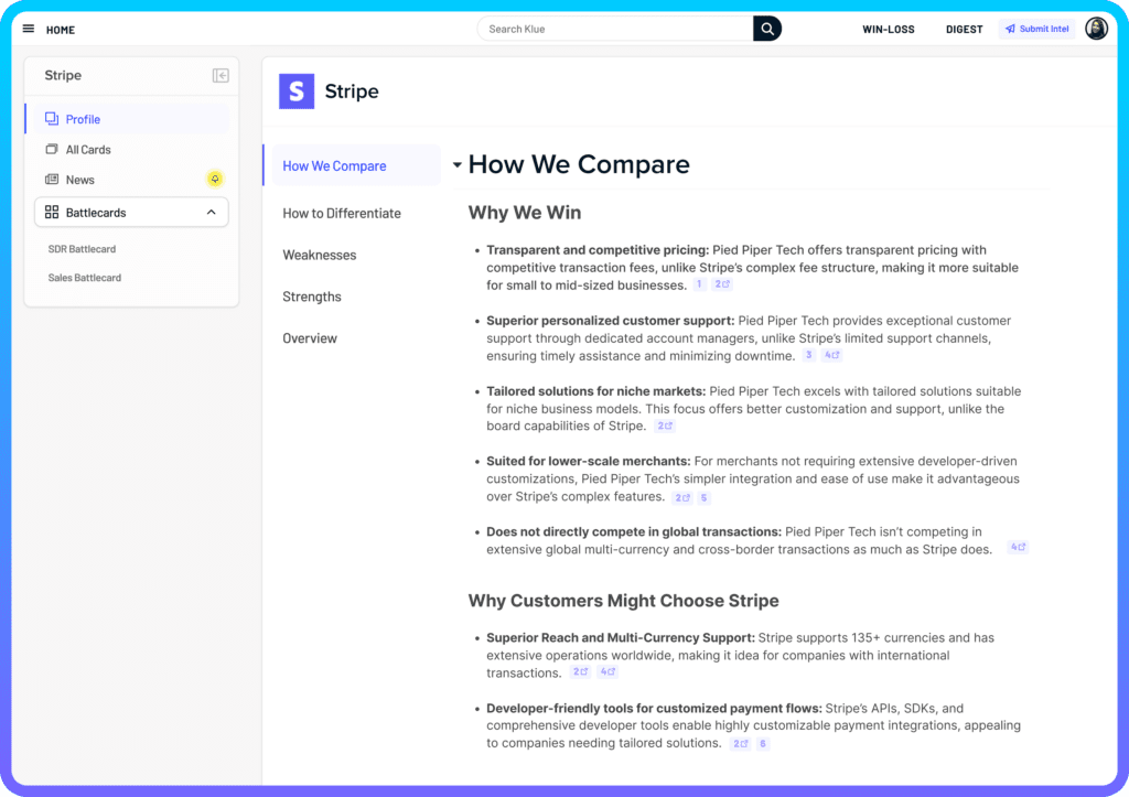 Once Klue AI has that information, it uses it to automatically generate or enrich Competitor Profiles for the competitors you’re tracking in Klue. These profiles include key information such as how you compare, how to differentiate, and your strengths and weaknesses.
