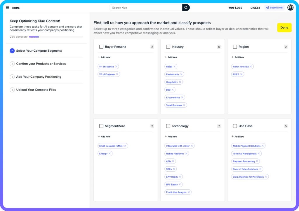 The Knowledge Hub gives Klue AI context on every aspect of your business including your GTM strategy, product lines, messaging and positioning, target personas and use cases, industries you sell into, and more.