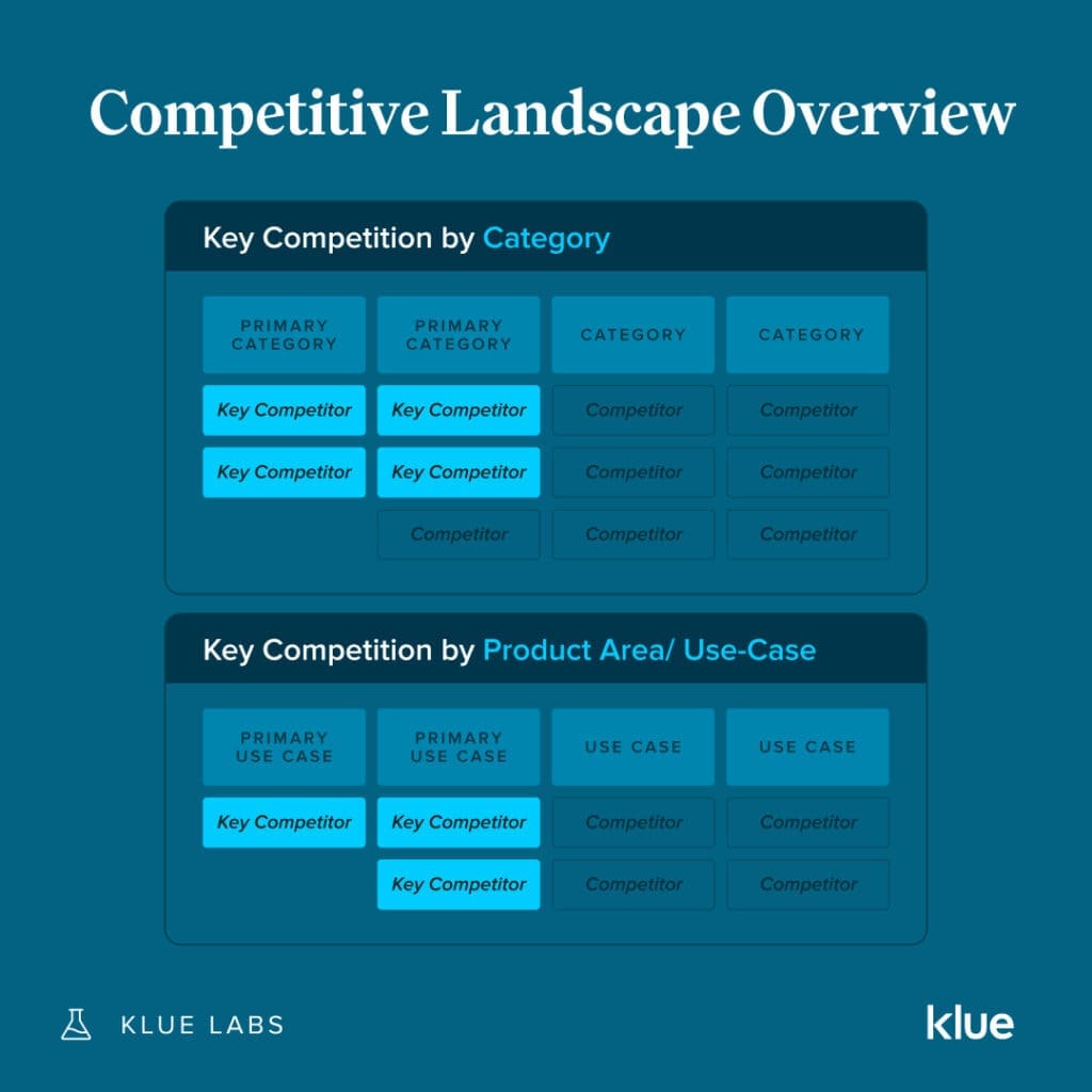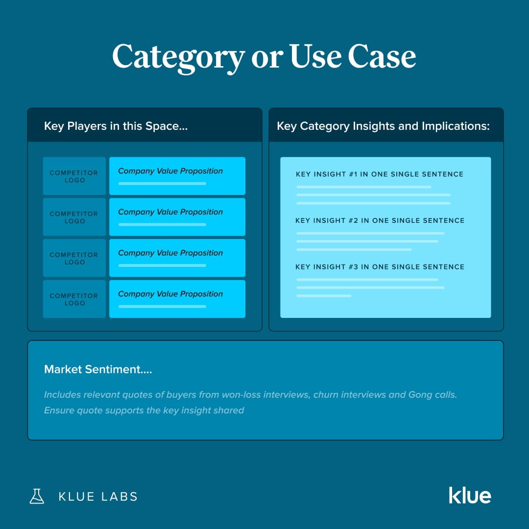 Klue’s own Competitive Enablement Manager, Hunter Sones, created the competitive landscape analysis for senior leadership by focusing on an overview of competitors by category and by use case, followed by key insights, implications to the business, and buyer sentiment.