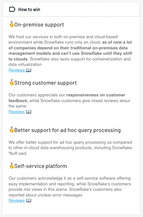Formatting the “Why We Win” battlecard like this helps put a personal touch on your sales pitch and allows for a bit of name-dropping, which helps build credibility.